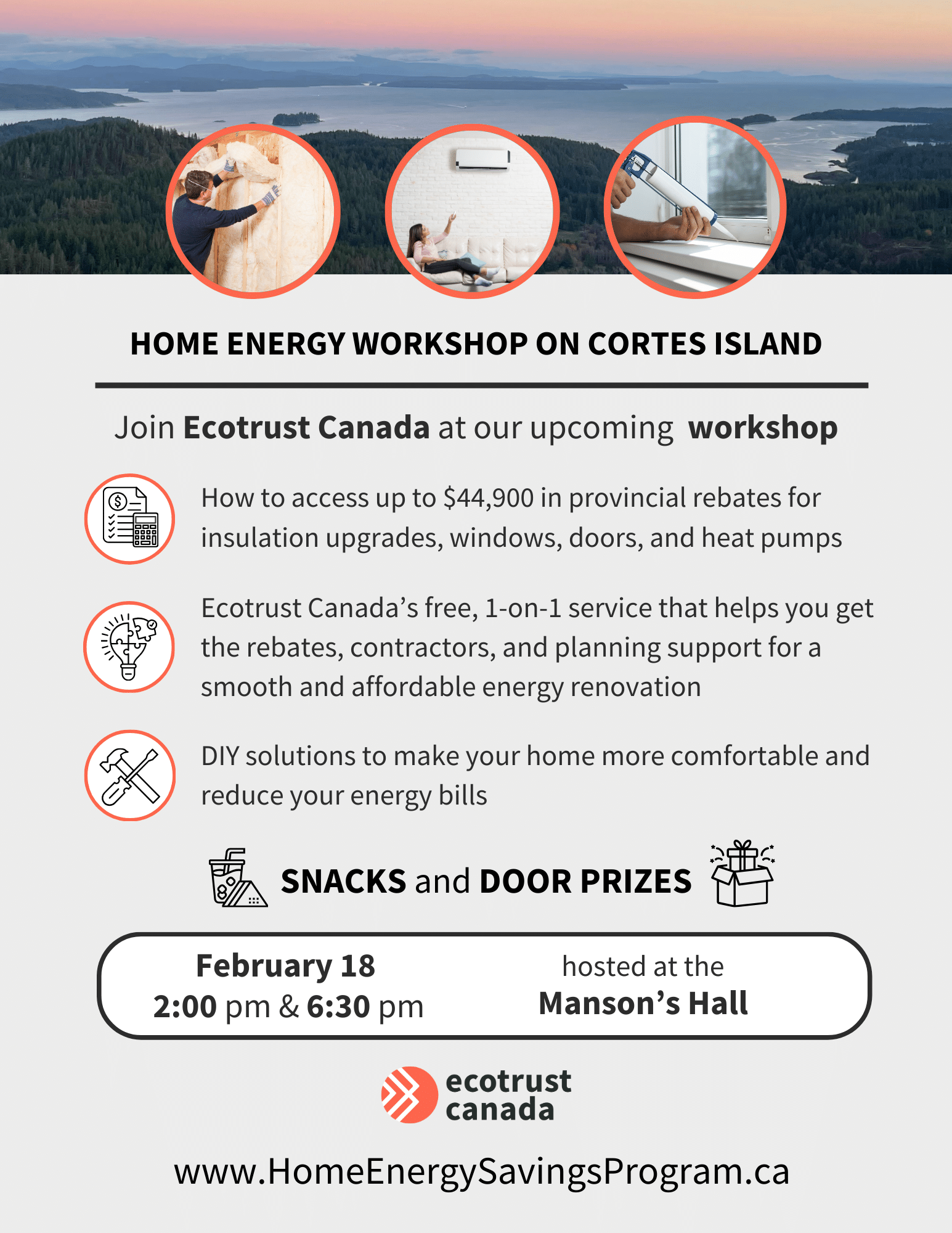 Learn how to save money and lower your carbon footprint at two free workshops on Tuesday, February 18th (2 pm and 6:30 pm) at Manson’s Hall. Folks from Ecotrust Canada will explain how to access government rebates to upgrade your home and install heat pumps.